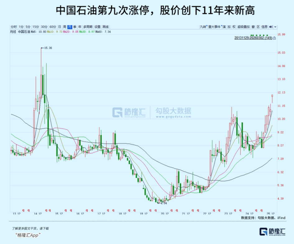 中东战局撬动了期货和个别股票板块,中国石油A股一共就9次涨停,而收盘时“三桶油”竟然都涨停了!这在历史上还是第一次。