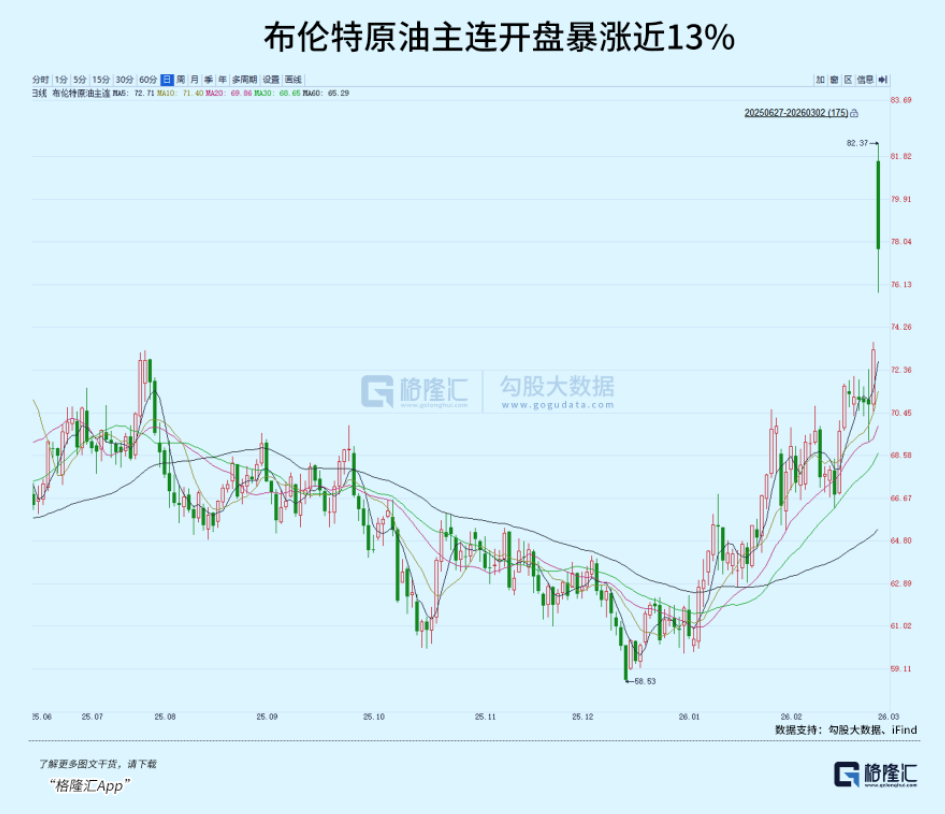 周一,布伦特原油开盘跳空高开至82美元附近,涨近13%。WTI原油期货也涨超10%,报75美元/桶,集运指数(欧线)期货直接封了涨停板。