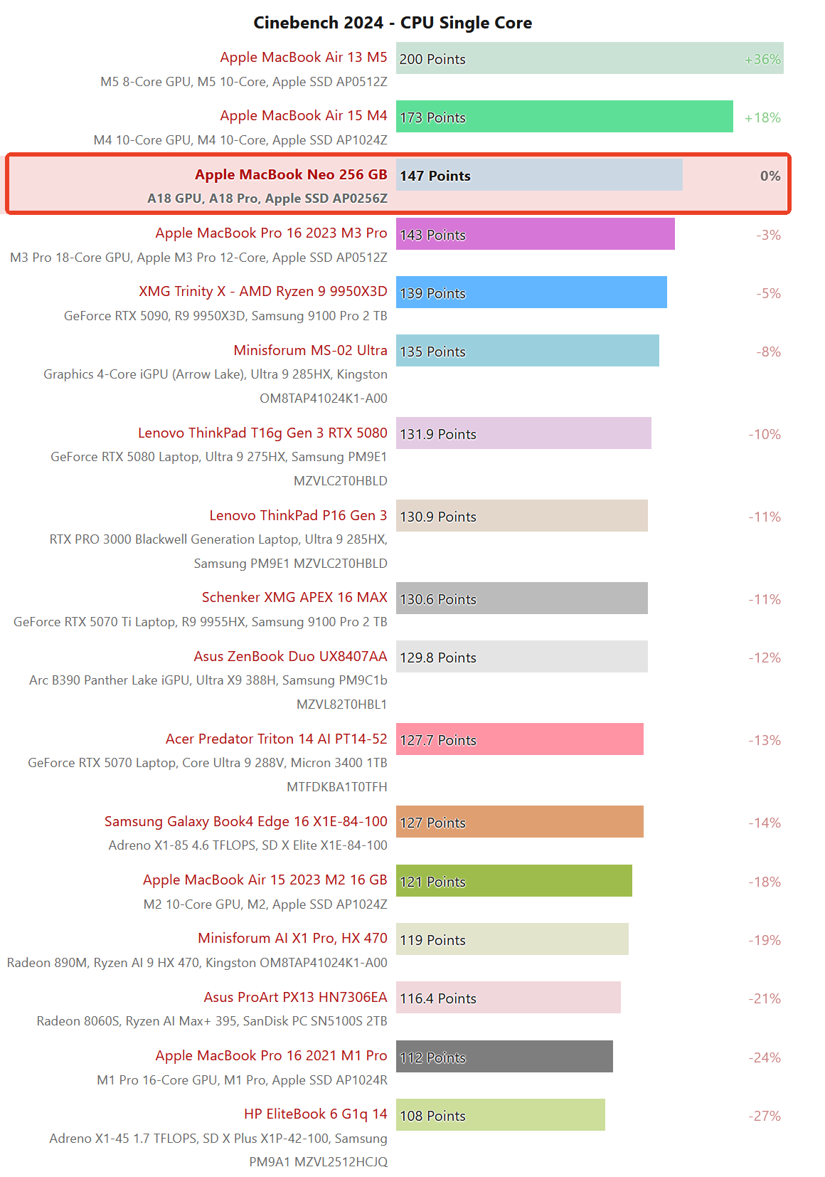IT之家 3 月 14 日消息,科技媒体 Notebook Check 昨日(3 月 13 日)发布评测报告,指出在 Cinebench 2024 单核测试中,苹果 MacBook Neo 达到 147 分,超过宏碁、华硕、惠普和联想等品牌的 Windows 11 笔记本。