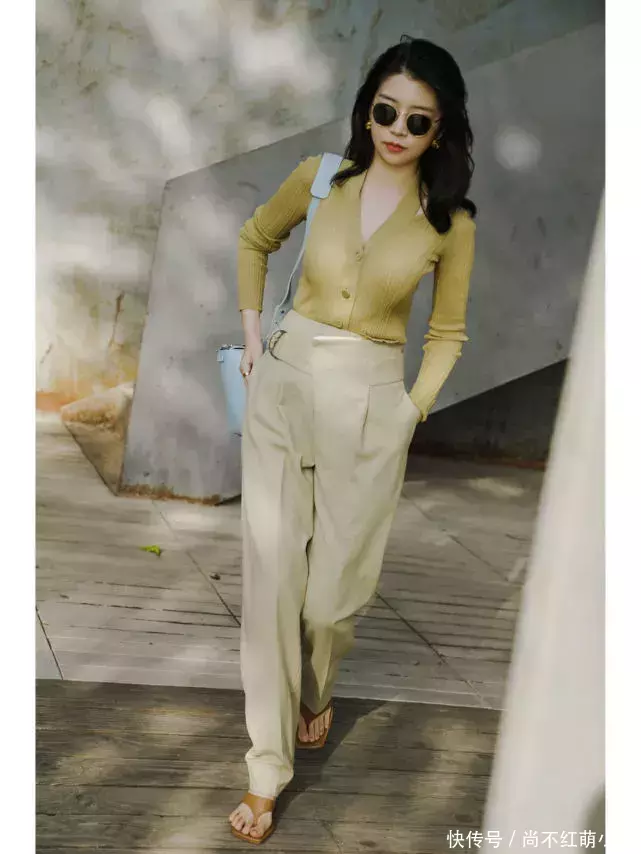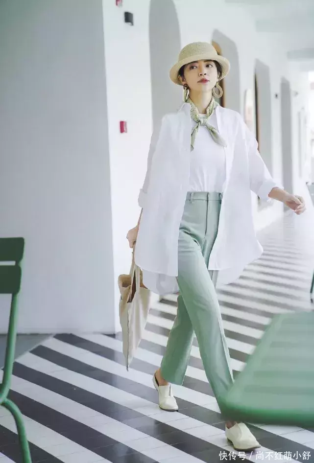 比如:三木经典的“绿色针织开衫 + 米色高腰裤”,并不是全绿色,而是浅绿与米白的搭配。就像两杯不同奶量的咖啡,一杯是双倍奶的拿铁,温柔如云;一杯是略加奶的卡布,暖调淡淡。两相搭配,既有统一感,又有层次过渡,比单穿一种白色更有呼吸感。